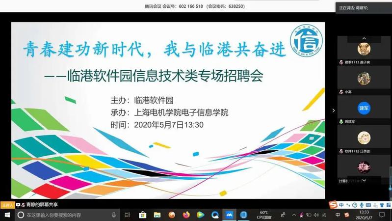 5月7日下午,在这春暖花开的日子里,经过多方精心筹备,以“青春建功新时代,我与临港共奋进”为主题的临港软件园信息技术类专场招聘会在“云端”如期举行。此次招聘会由临港软件园主办,上海电机学院电子信息学院承办,旨在促进2020届毕业生更加充分就业、启动2021届毕业生实习进程。上海临港软件园发展有限公司副总经理朱钢、电子信息学院党总支书记蒋建军、电子信息学院党总支副书记张珂出席招聘活动,上海电机学院学生处副处长张跃辉也前来观摩指导。参加本次空中宣讲会的还有来自临港软件园的企业HR、全体辅导员、毕业班班主任以及2020、2021届毕业生,活动由张书娟老师主持。