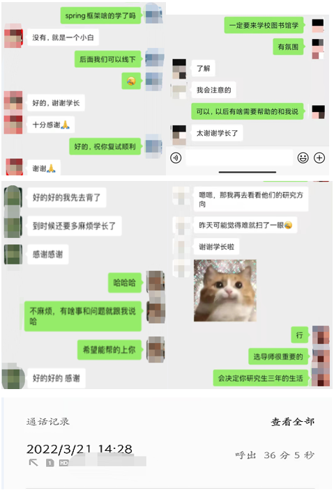 研究生志愿服务队的同学们八仙过海,各显神通,他们通过线上线下的形式开启了一对一专属的考研复试调剂指导。在校内的同学,第一时间联系第一时间开展工作,面对面的沟通交流,让指导更加有温度;不在校内的同学,也借助微信、QQ、电话、小视频等多种方式为同学们送去及时的服务。
