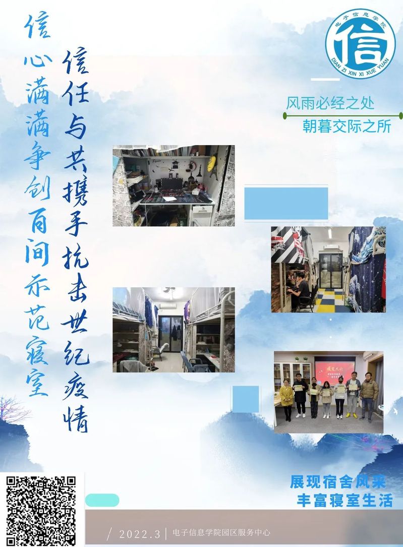 特色寝旨在鼓励同学们在美化寝室,打造整洁、安全、舒适、和谐的寝室学习环境的同时,培养各种课外技能和才艺本领,展现别具特色的学院“信”文化以及寝室文化。同学们可以晒出寝室特色、晒出寝室风格,晒出准封闭管理期间的特色活动等,鼓励同学们展现不同的专业特色,弘扬电子信息学院学生的青春与风采。
