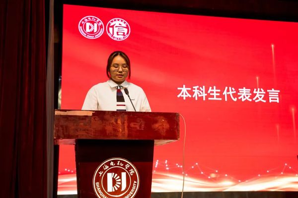 本次典礼还邀请了本科生和研究生新生代表进行发言。本科生代表计算机类2312班王梦莹表示希望大家能够在上海电机学院提供的优越的学习环境里奋力拼搏,用青春的笔尖绘出自己美丽的人生蓝图。研究生代表刘静表示将时刻铭记学校“明德至善,博学笃行”的校训和我院“电聚四海,信达天下”的院训,并以此为行动准则,不断提高自己的道德修养和专业知识水平。