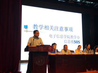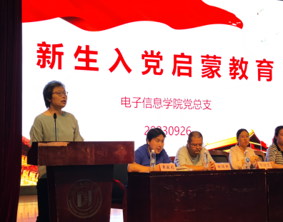 思想引领方向,会议伊始,陆平老师为新生带来一场严肃的入党教育,就新生关心的入党条件、入党流程、入党申请书如何撰写等内容展开了详细的介绍。同时,她引导新生要坚持以习近平新时代中国特色社会主义思想为指导,坚定共产主义信念,努力践行全心全意为人民服务的宗旨,积极向党组织靠拢。教学联动一直是电子信息学院实行全员育人的有效抓手,会上,学院教务钟旭老师就教学相关注意事项为新生们答疑解惑,分享期末考试、补(缓)考、学生学业警示、选课、学分认定、转专业、大类招生专业分流和毕业学位资格等内容,提醒新生经常查看教务系统通知,提高学习主动性,努力深耕专业知识。