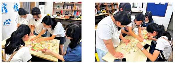 随后,拼图环节正式开启。同学们以小组为单位,围绕着印有中秋玉兔、传统宅院、祥云花灯等元素的拼图展开协作。大家或俯身细寻拼图边缘,或围聚一起比对图案,在一块块碎片的拼接中,中秋的团圆图景逐渐清晰。从零散的拼图块到完整的中秋画面,每一次契合都伴随着同学们的欢呼,每一组作品的完成都是团队智慧与默契的结晶。