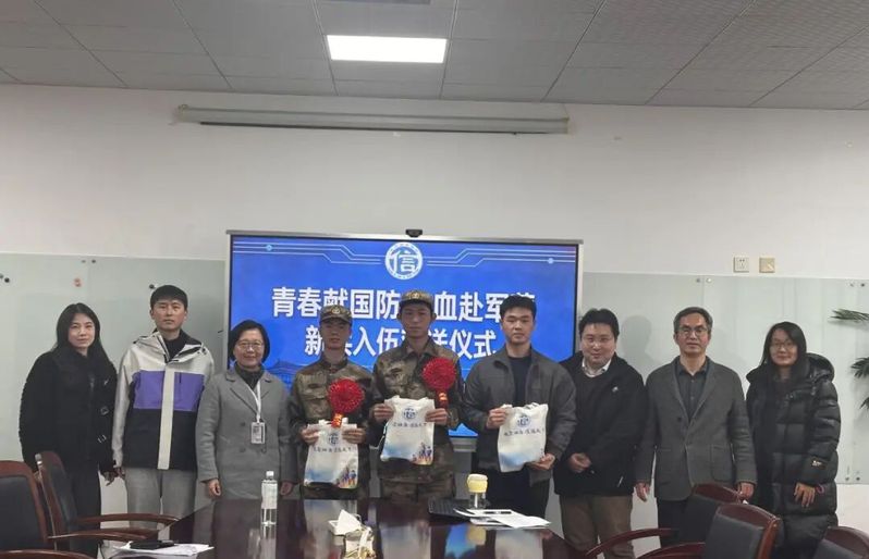 贾欣歌老师在主持讲话中强调,从校园到军营,不仅是身份的转变,更是责任的升华,希望三位同学珍惜军旅生活,将青春理想融入强军实践,展现新时代信息学子的家国情怀与使命担当。仪式最后,学院领导为入伍新兵赠送纪念品,并合影留念。